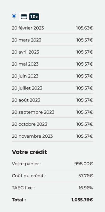 Par exemple pour un achat de 998€ effectué le 20 février 2023, vous serez débité 10 fois suivant l’échéancier suivant :