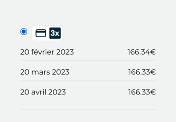 Par exemple pour un achat de 499€ effectué le 20 février 2023, vous serez débité 3 fois suivant l’échéancier suivant :