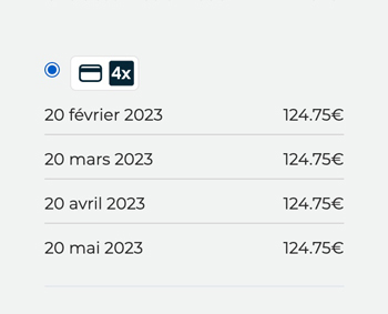 Par exemple pour un achat de 499€ effectué le 20 février 2023, vous serez débité 4 fois suivant l’échéancier suivant :