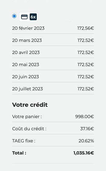 Par exemple pour un achat de 998€ effectué le 20 février 2023, vous serez débité 6 fois suivant l’échéancier suivant :